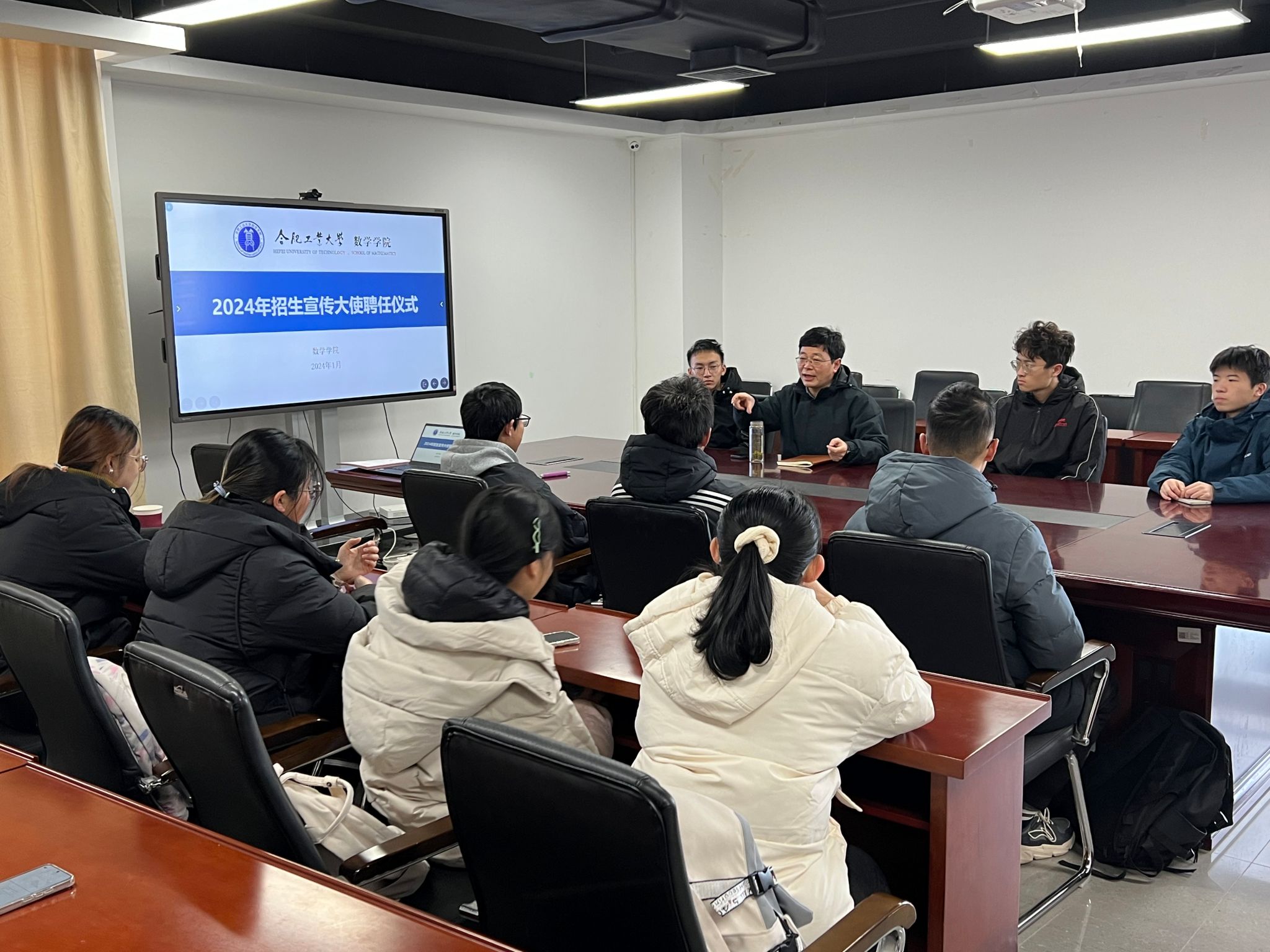 1月23日上午,数学学院在翡翠湖校区科教楼B座1710室开展了2024年招生宣传大使聘任仪式暨招生宣传工作布置会。数学学院党委副书记兼纪委书记彭帮国、相关年级辅导员和新聘任的24名招生宣传大使参加了此次活动。