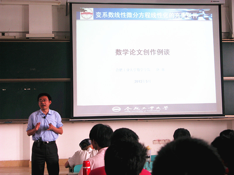 5月22日下午,在翡翠湖校区一教202教室,唐烁教授举行了题为“变系数线性微分方程线性化的充要条件”的专题报告。报告中,唐烁教授对微分方程中关于常系数微风方程线性化进行了深刻阐述,通过旁征博引、巧妙变型、知识迁移,提出了变系数微分方程线性化的充要条件,为解决相关问题提供了新的思路。此外,唐烁教授结合所讲内容,号召广大数学学子在学习知识、应用知识之余,能够勤于思考、善于发现、敢于创新。最后,他就如何进行数学论文创作和培养科研能力等方面,与现场学生进行了深入而热烈的交流。