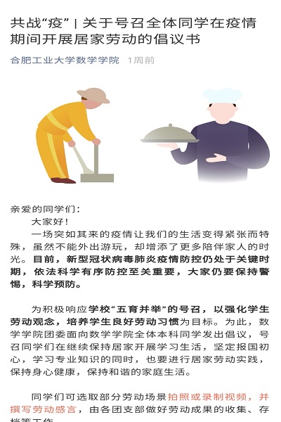 虽然没能身披白衣奔赴一线与时间赛跑,虽然没能全副武装科研攻关与病毒肉搏,但每一名数学学子都在用自己的方式践行青春担当,居家抗疫,以劳树德。今后,数学学院将继续深化落实学校“五育并举”人才培养体系,教育引导学生崇尚劳动、尊重劳动,以劳树德、以劳增智、以劳强体、以劳育美促进学生全面发展。