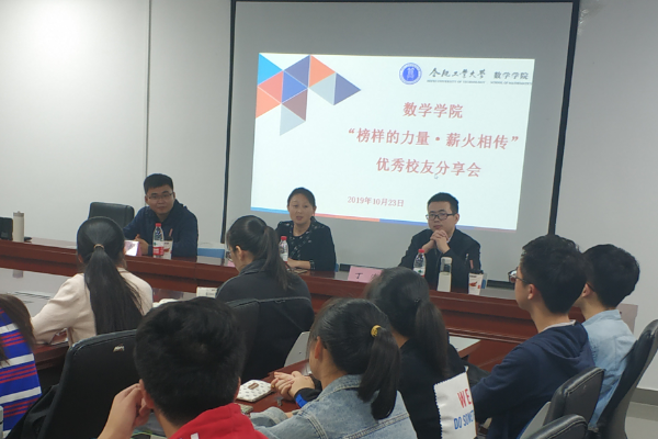 10月23日晚,数学学院“榜样的力量﹒薪火相传”优秀校友分享会在翡翠湖校区翡翠科教楼B座1710举办。数学学院2012届、2013届数学与应用数学专业毕业生,合肥工业大学经济学院教师柯睿和丁涛应邀参加交流会。
