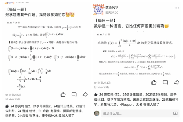 同时,为了助力学生更好地掌握数学知识,提升数学素养,数学学院创新学习辅助方式,自11月18日起利用学院QQ号开展“每日一题” 数学题推送活动。学院将持续推进这一活动,并不断优化题目内容和形式,为学生提供更优质的数学学习资源,努力营造良好的学习氛围,激发学生自主学习的积极性,培养学生的数学思维和创新能力。